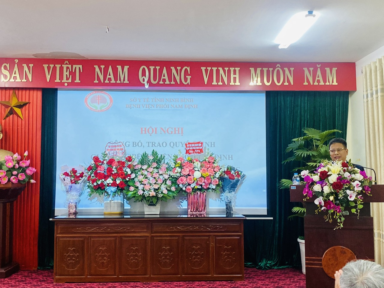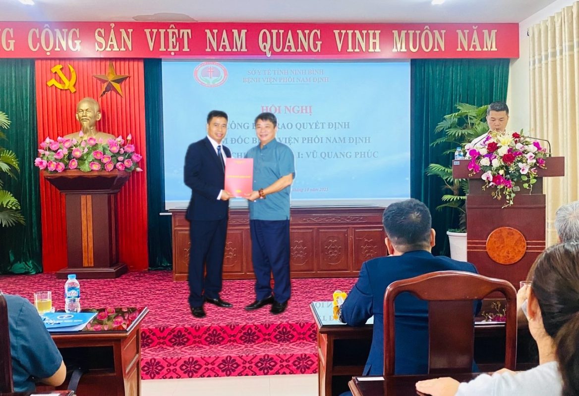 Đ/c Nguyễn Huy Lợi – Phó trưởng phòng Tổ chức cán bộ – Sở Y tế công bố quyết định của Giám đốc Sở Y tế tỉnh Ninh Bình bổ nhiệm Bs CK1 Vũ Quang Phúc – Q. Giám đốc giữ chức vụ Giám đốc Bệnh viện Phổi Nam Định kể từ ngày 07/10/2025. Thời hạn bổ nhiệm là 5 năm.